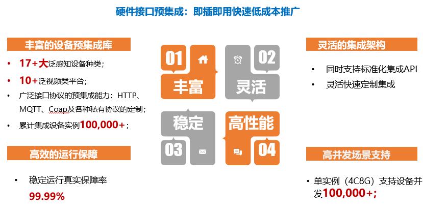 迄今ca888亚洲城公司已经预集成17+大泛感知设备种类,10+泛视频类平台,广泛接口协议的预集成能力涵盖了HTTP、MQTT、Coap及各种私有协议的定制,累计集成设备实例达100,000+。它还支持标准化集成API,可灵活快速地定制集成,通过构建规则引擎,实现了各设备间的联动应用,比如检测到违规停车,联动广播就会自动播报提醒,为社区管理服务赋能。